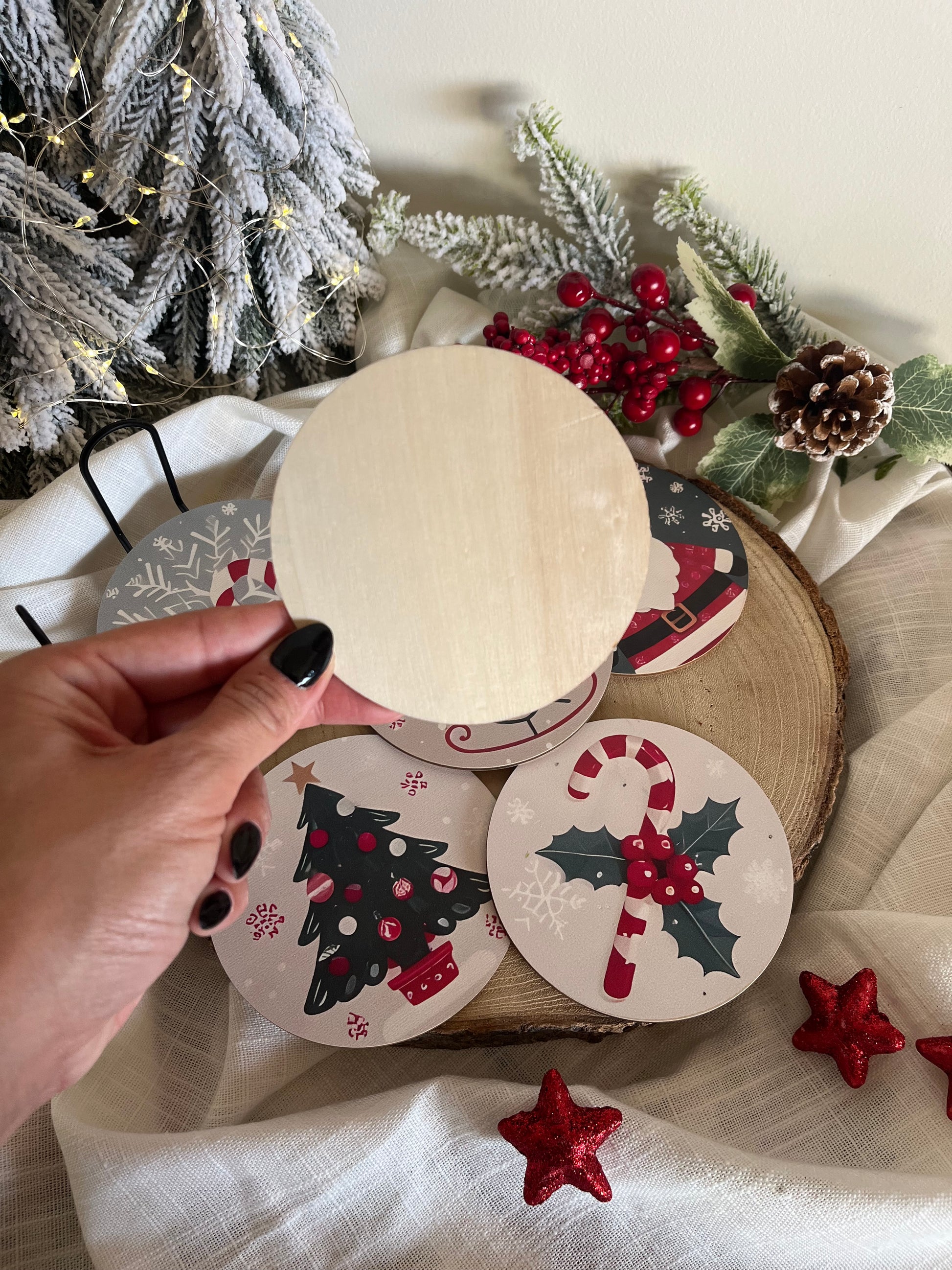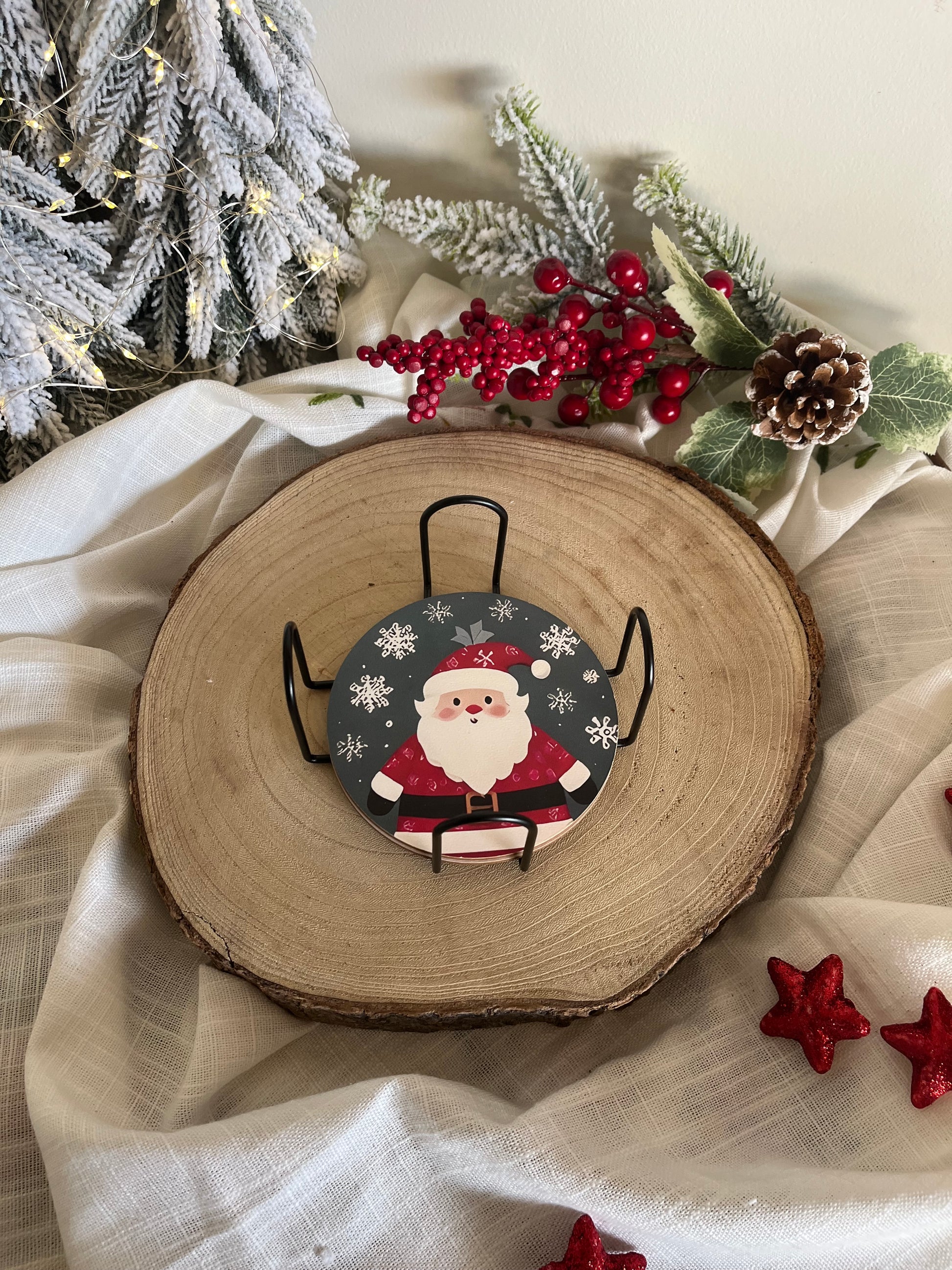 Display your holiday spirit with the Christmas 6 Coasters & Stand Set. This set includes 6 wooden coasters with light pastel designs. The coasters are complemented by a sleek black metal stand, making it the perfect addition to any festive decor. Enjoy your favorite drinks while protecting your surfaces in style.