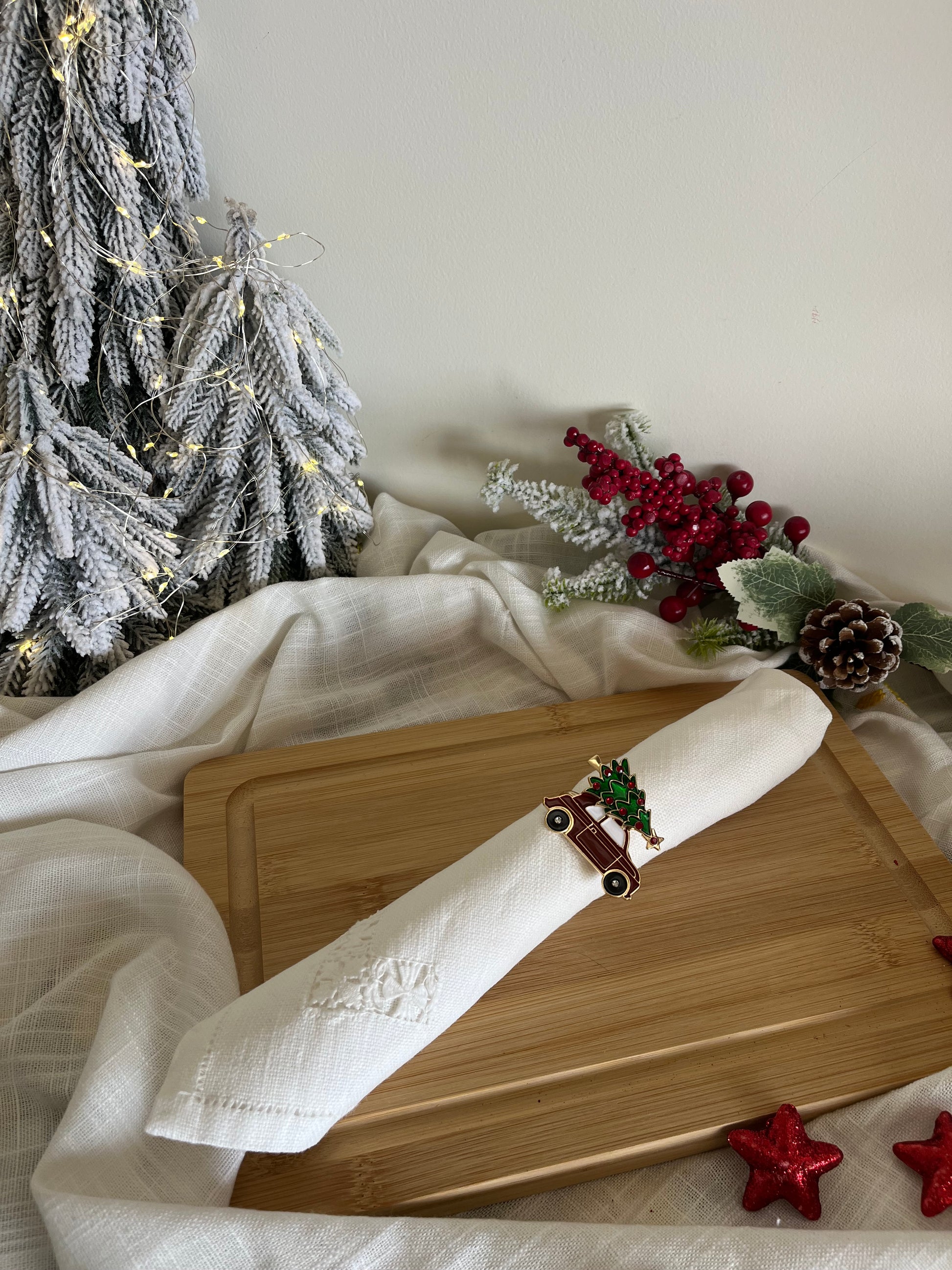 Add a festive touch to your holiday table with our Christmas Car Napkin Rings. These napkin rings feature a charming Christmas car design holding a tree in traditional gold, red, and green colors. Elevate your dining experience and impress your guests with these unique napkin rings.