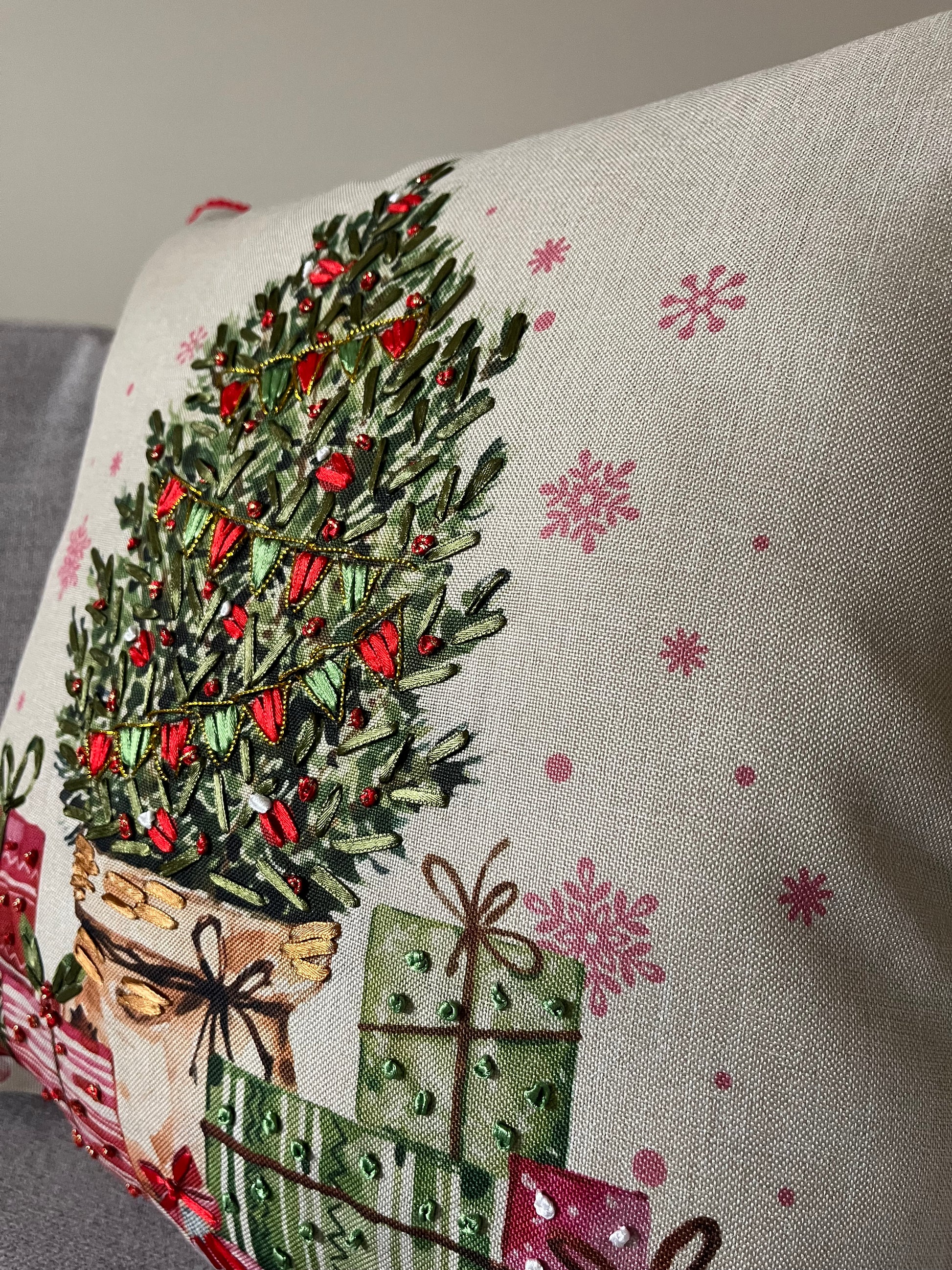 Introducing our Christmas Cushion Cover. Exquisitely embroidered with a festive tree design, this luxurious 45x45cm cover is the perfect addition to your holiday decor. The charming small pompom borders add a touch of whimsy to the elegant beige base, while the rich green and red colors evoke an enchanting winter wonderland. Complete your holiday aesthetic with this stunning cushion cover.