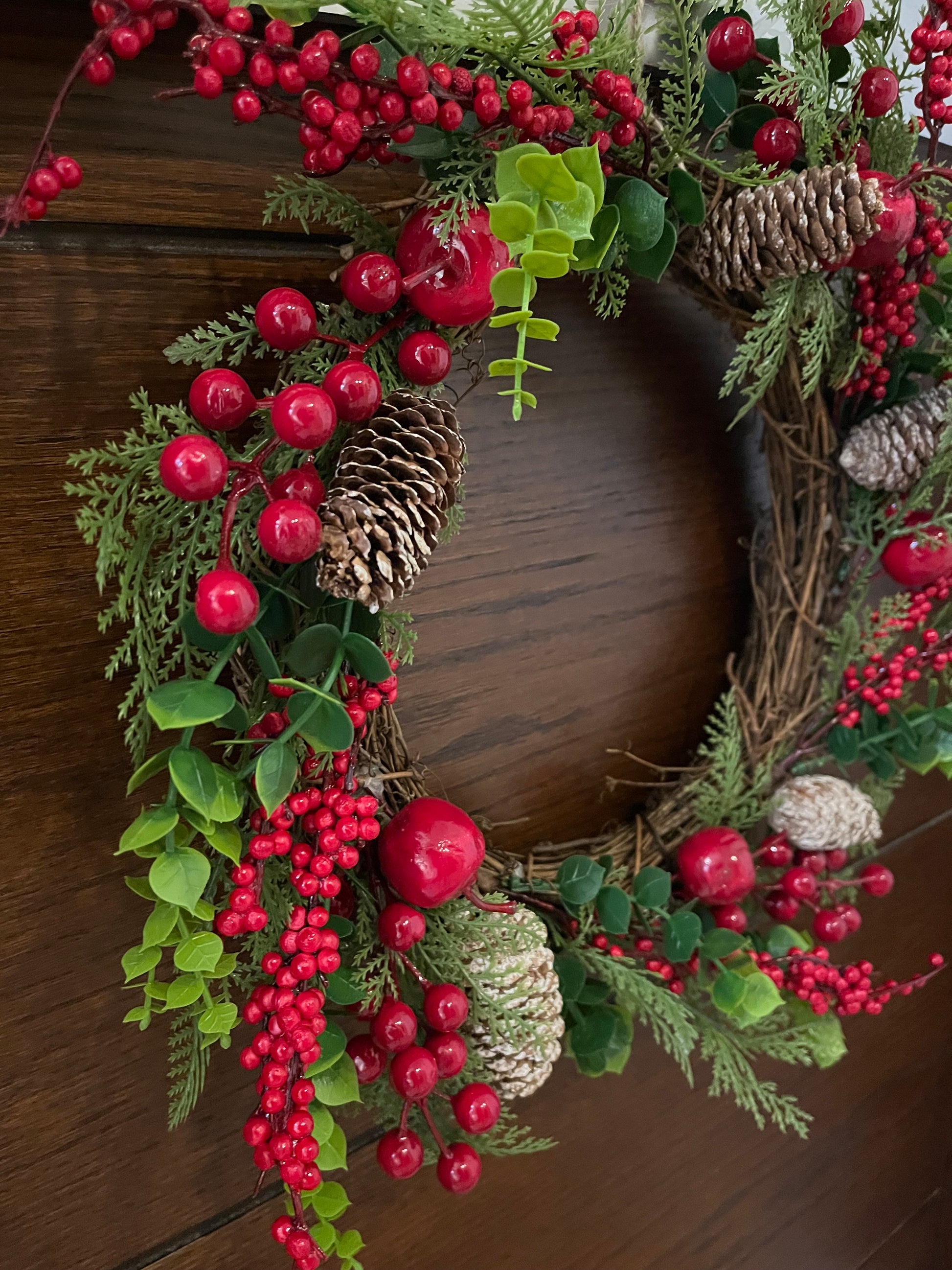 This Christmas wreath features luscious greenery, festively vibrant red cherries and classic pine accents. Made with high quality materials, it will add a touch of holiday cheer to any home. The perfect addition to your holiday decor, showcasing the beauty of the season.