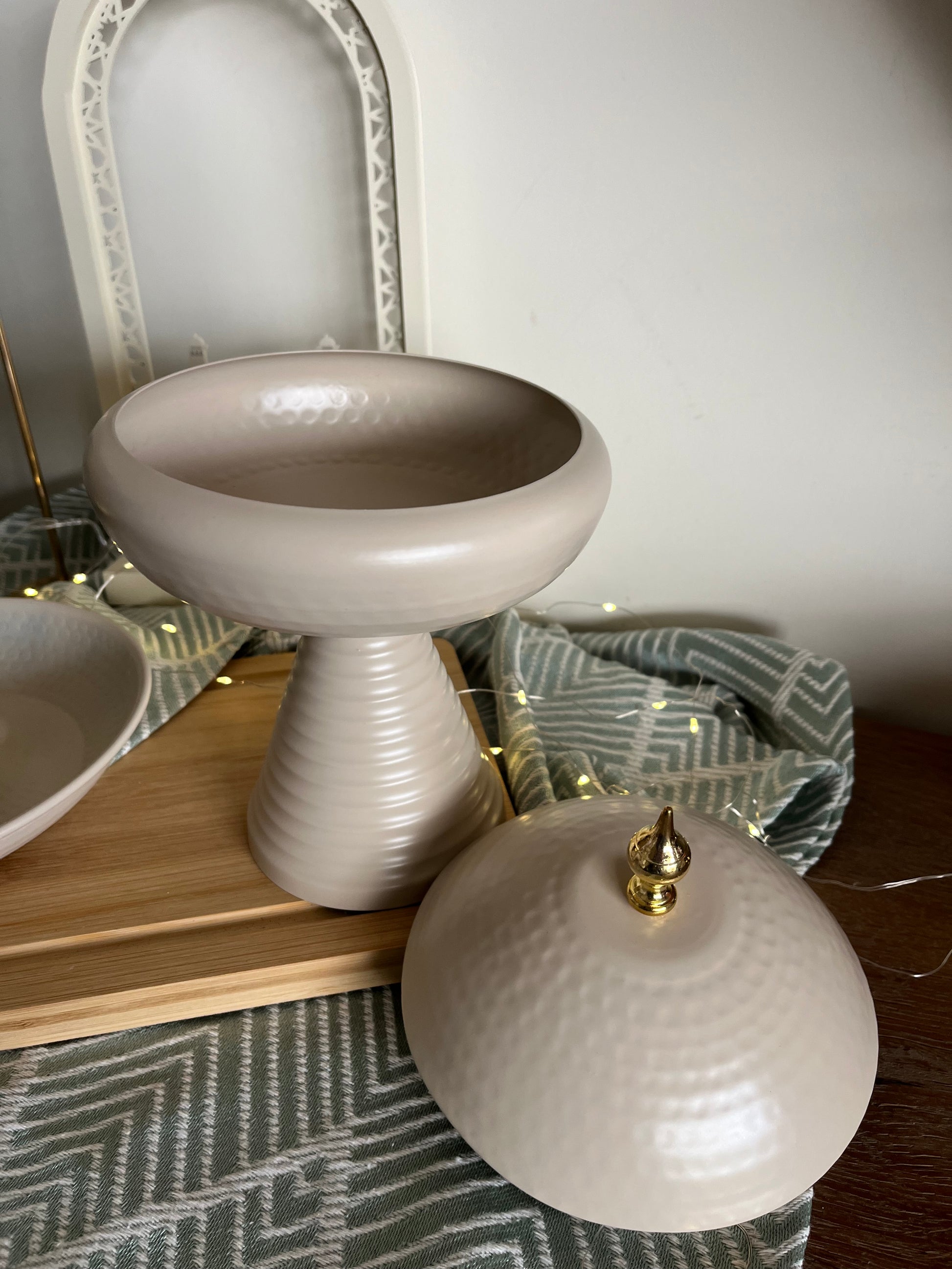 The Ramadan Covered Metal Plate features a durable greige metal construction mounted on a sturdy stand, available in two distinct sizes and designs. This design not only enhances presentation during meals but also provides stability, ensuring an elegant display for any occasion.
