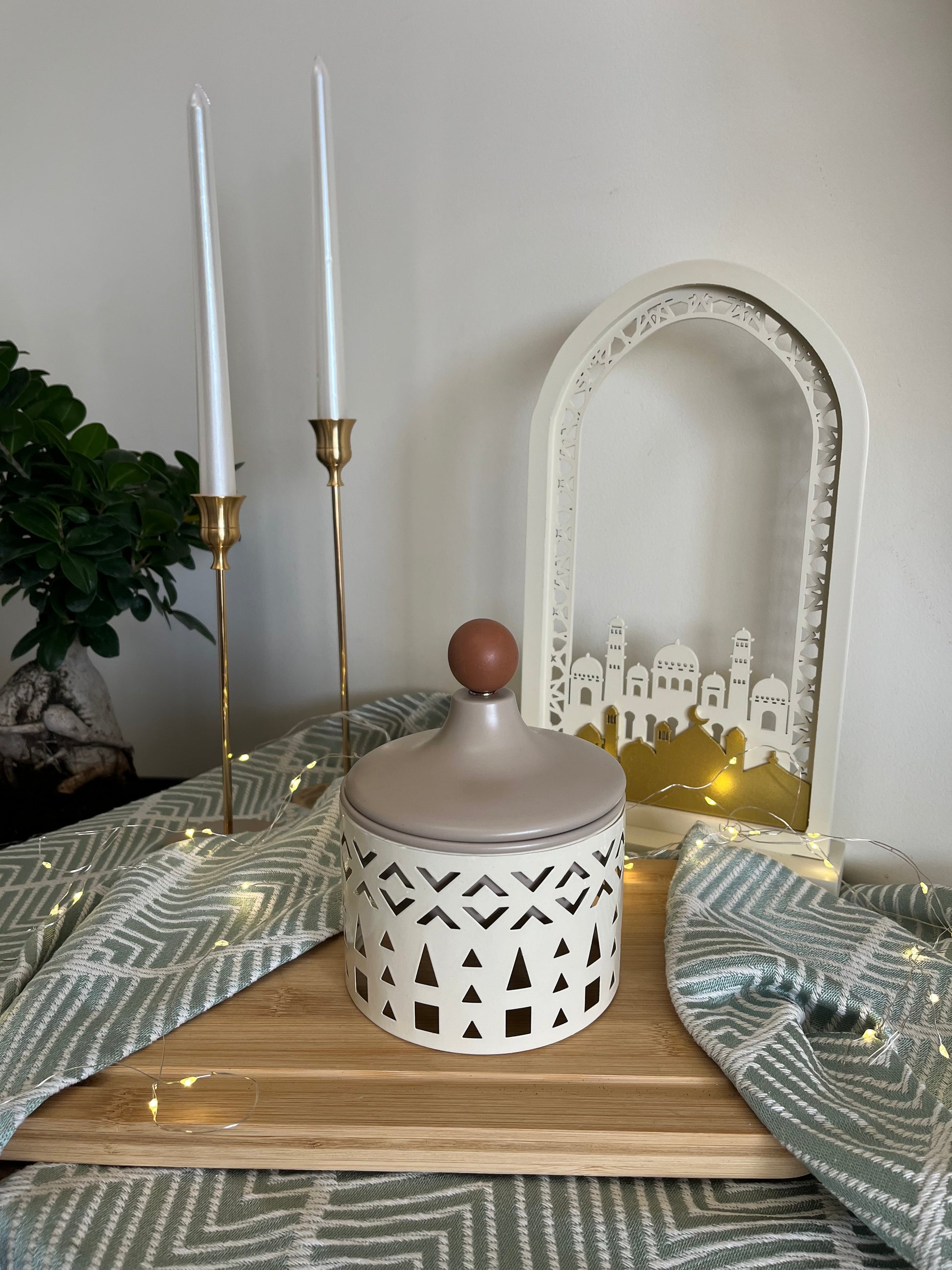 The Ramadan Covered Metal Small Plate features a beige base adorned with a geometric design, promoting a visually appealing aesthetic. Its greige cover, complemented by wood detailing, enhances durability and adds a touch of elegance, making it suitable for both decorative and practical use in Ramadan celebrations.