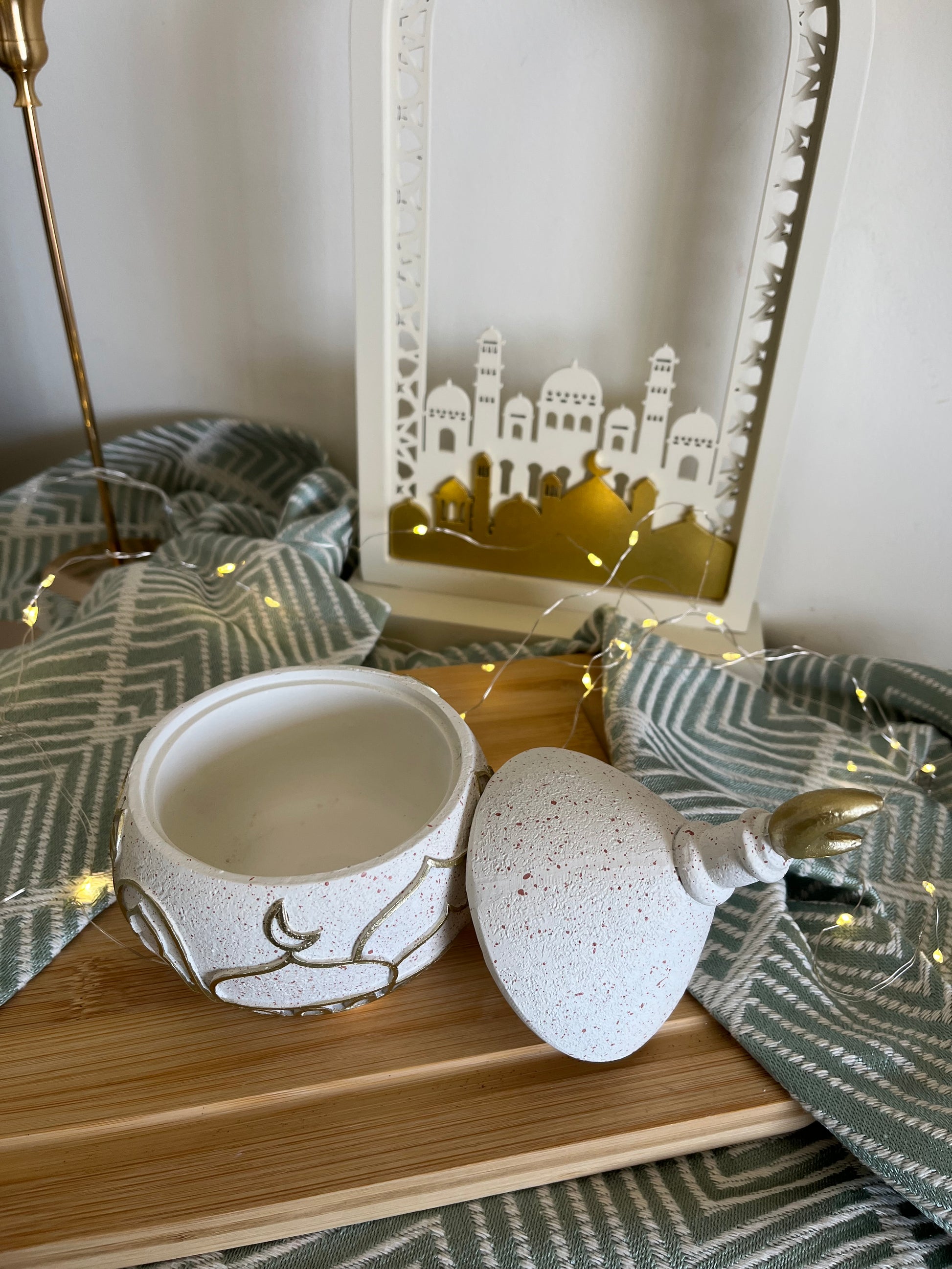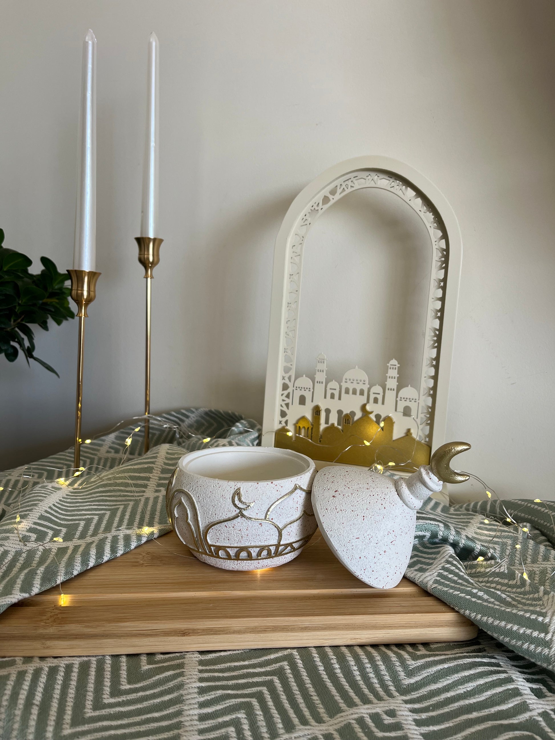 The Ramadan Covered Resin Plate is meticulously hand-painted, showcasing intricate Ramadan designs. This versatile plate is ideal for sugar or small confectioneries. Its artistic presentation also makes it a thoughtful gift, contributing to the festive atmosphere of Ramadan.