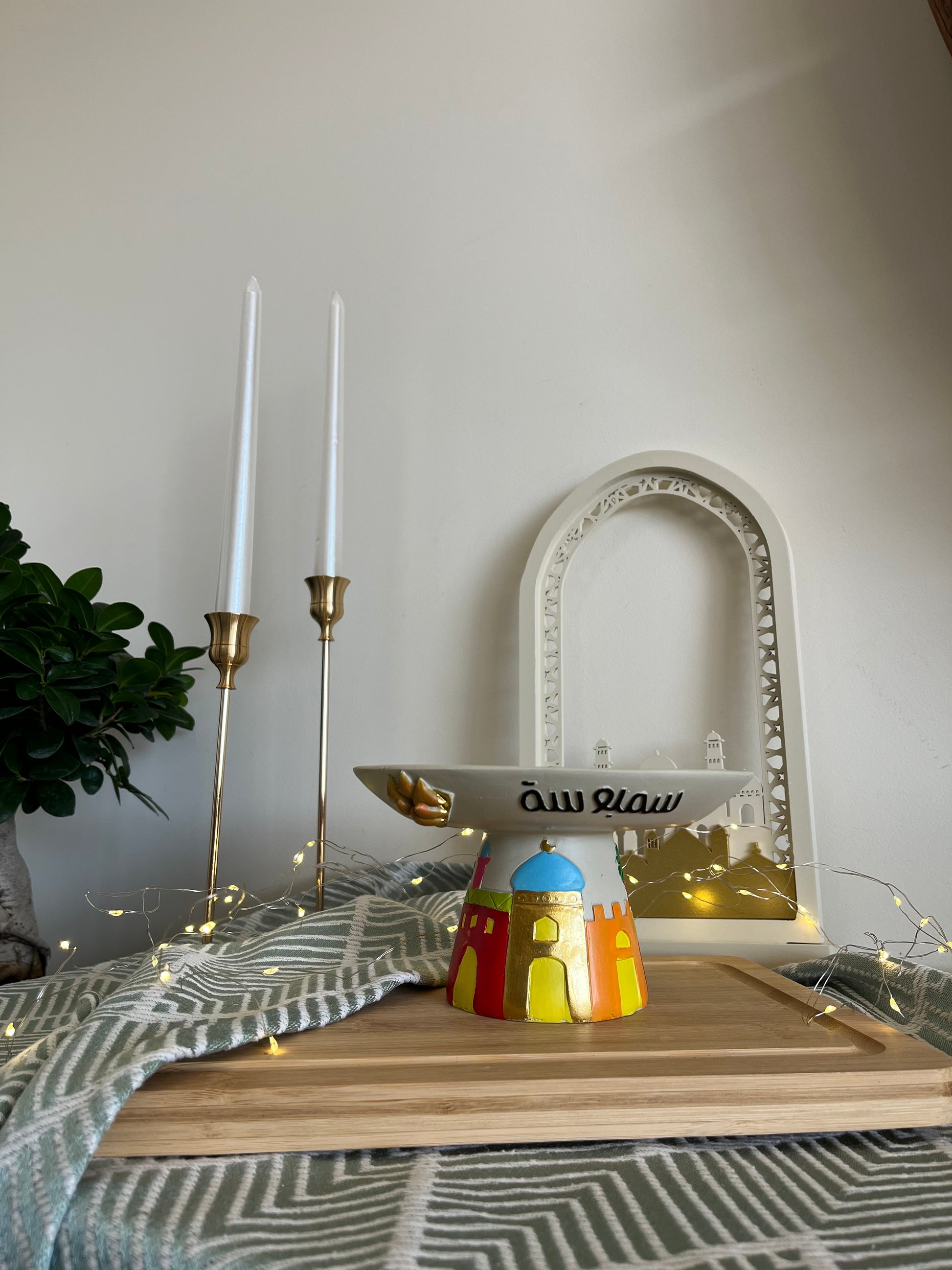 The Ramadan Decorative Colorful Resin Plate features a high design complemented by a vibrant stand, specifically crafted for serving sambousa. Its durable resin construction ensures stability, while the colorful aesthetic enhances festive presentation, making it ideal for gatherings and celebrations during Ramadan.