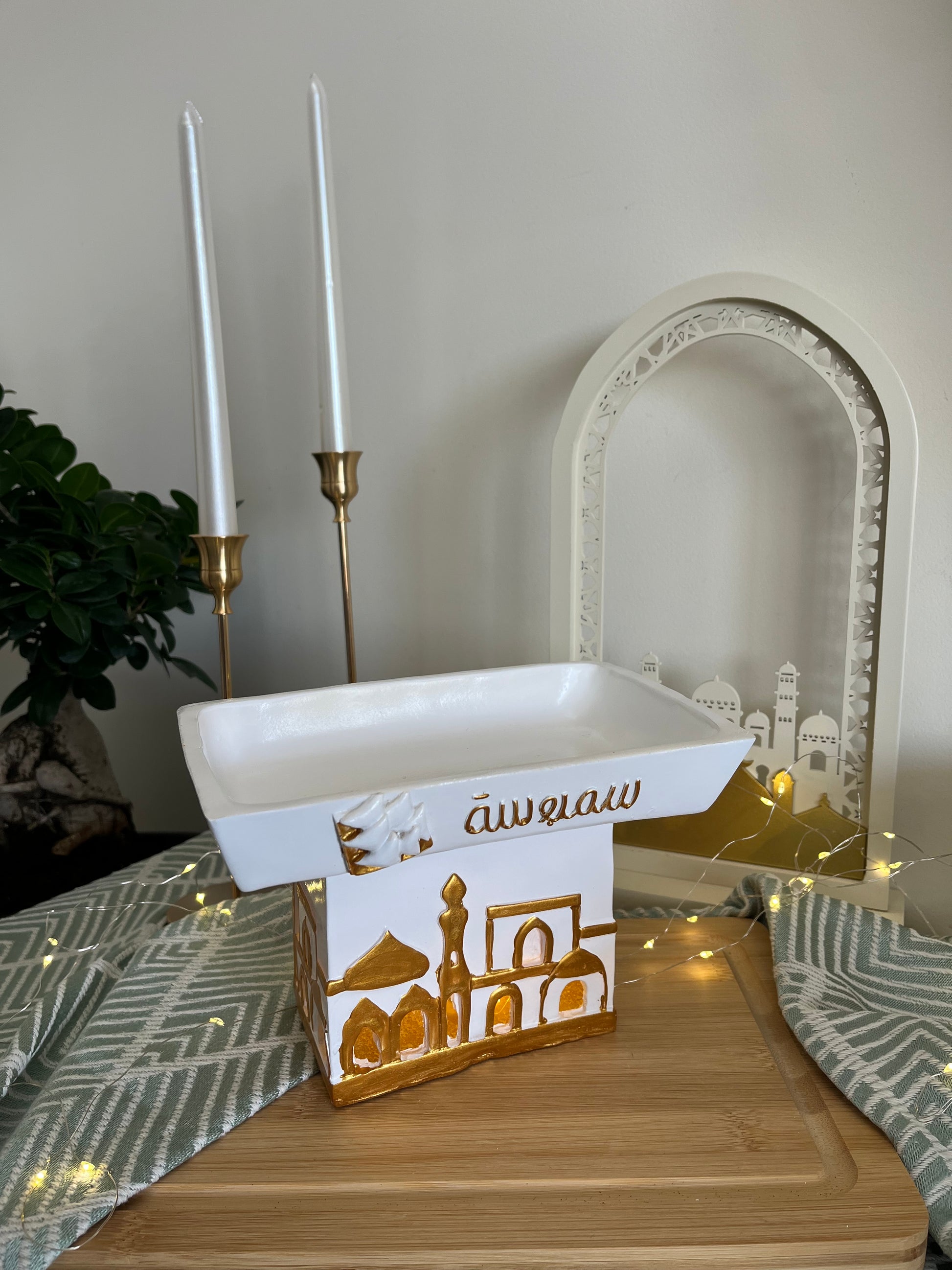 Enhance your Ramadan celebrations with this hand-painted decorative plate. Its vibrant Gold color not only add a festive touch to your décor but also feature integrated lights, providing a warm ambiance. Ideal for creating a welcoming atmosphere, it combines artistry and functionality for meaningful gatherings.