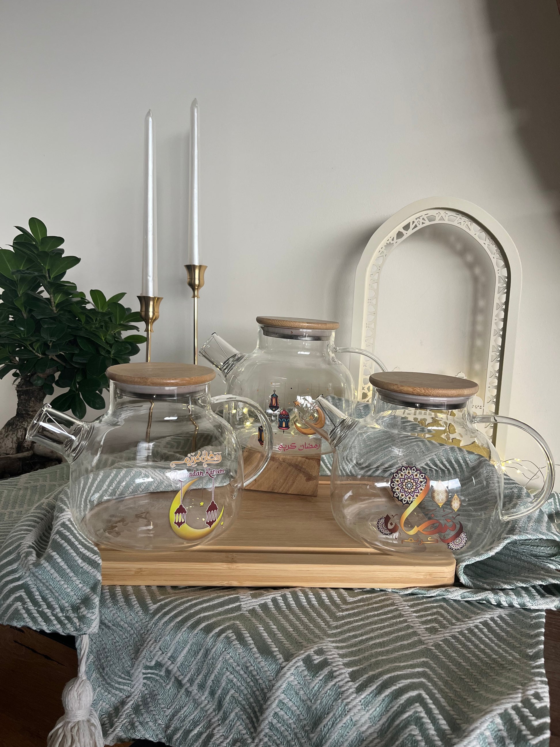 The Ramadan Glass Tea Pot combines a durable glass body with an elegant wooden cover, offering an aesthetic yet functional solution for tea preparation. Available in three distinct Ramadan-themed designs, this teapot enhances the cultural experience of tea serving during the festive month, contributing to traditional hospitality.