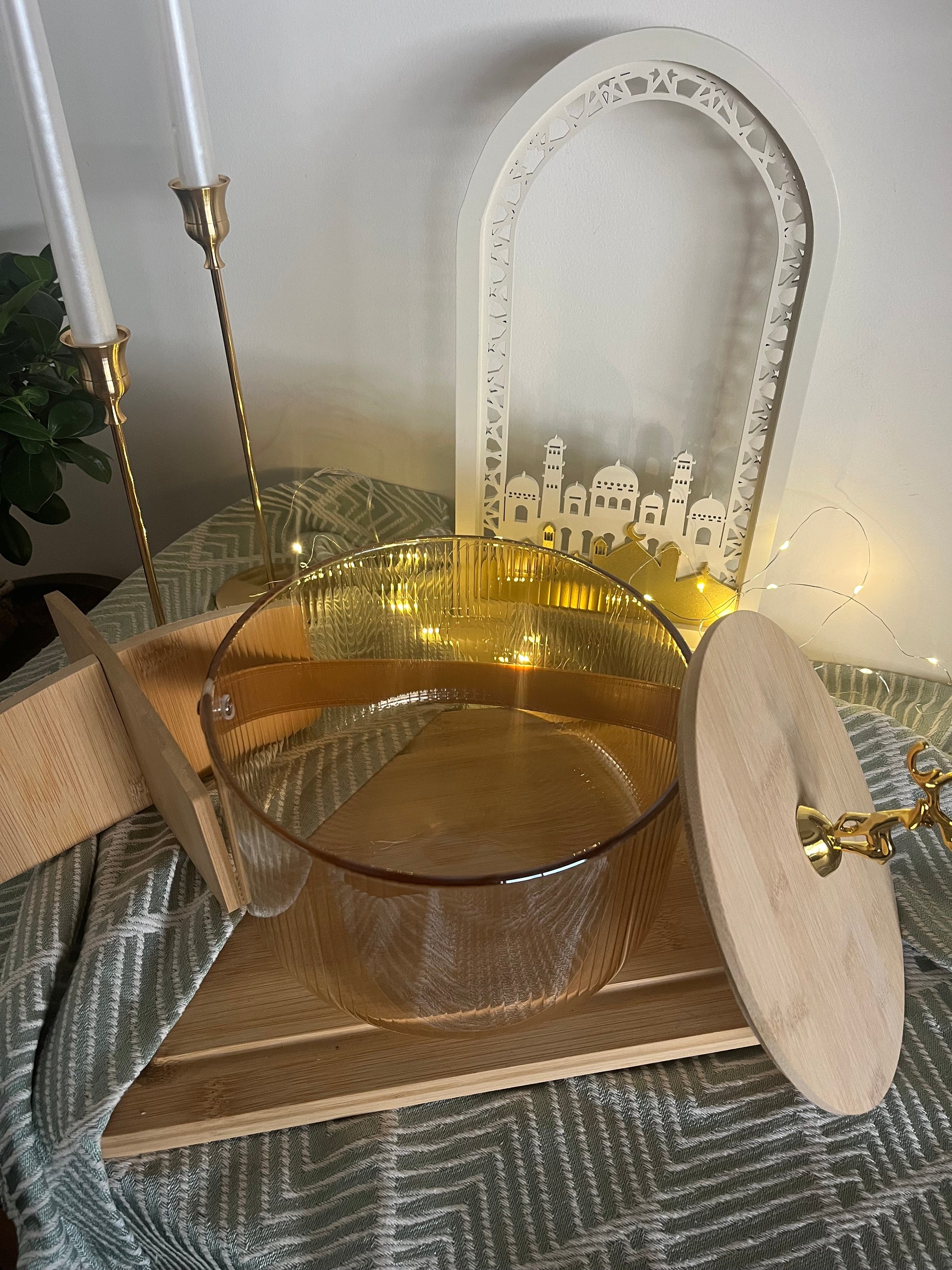 The Decorative Lidded Storage Container features a glass body with a wood lid, elegantly adorned with a gold deer motif. It includes removable wood dividers, creating four distinct compartments ideal for organizing chocolates and confections. This versatile design also makes it suitable for gifting, enhancing both presentation and functionality.