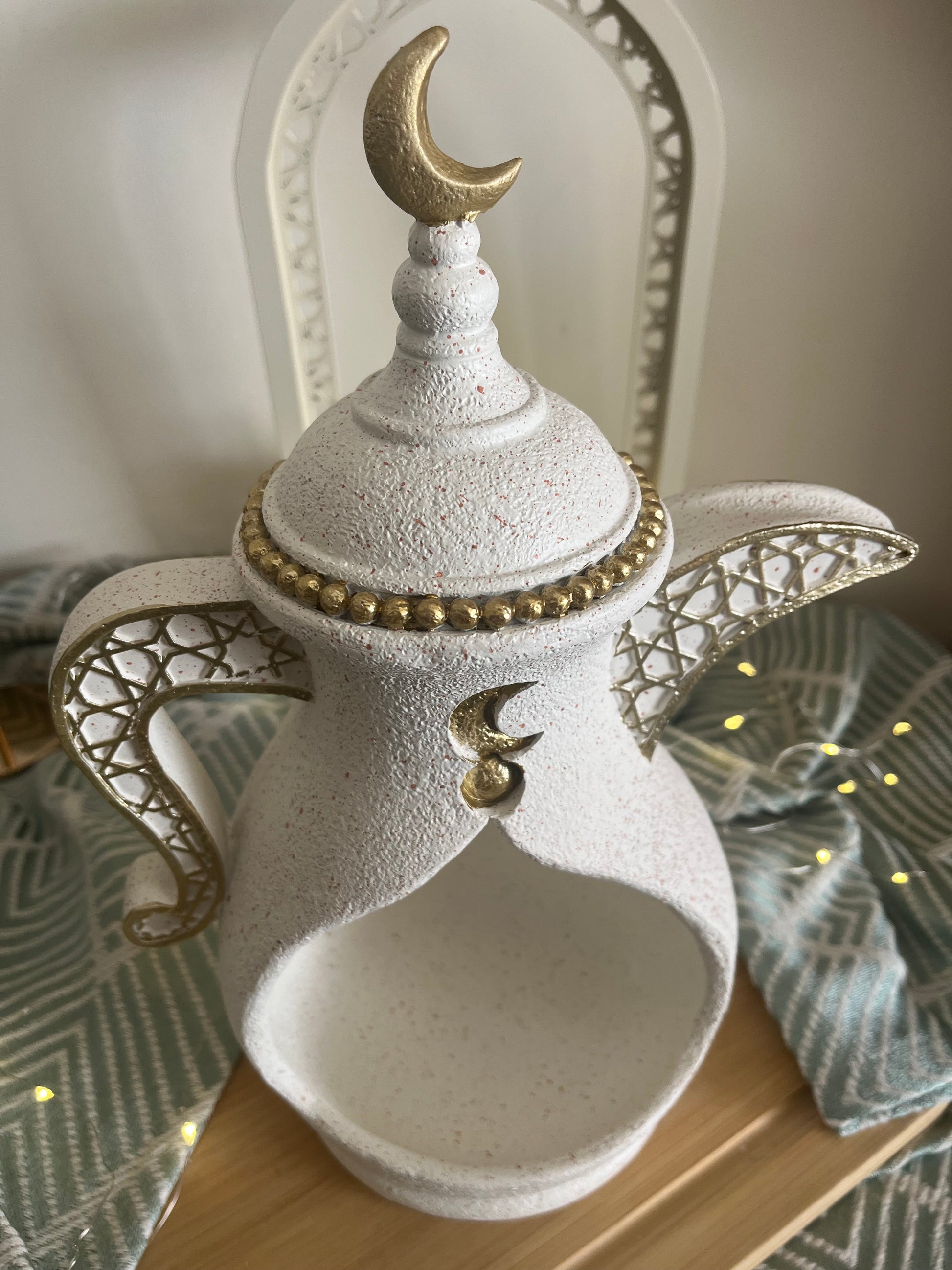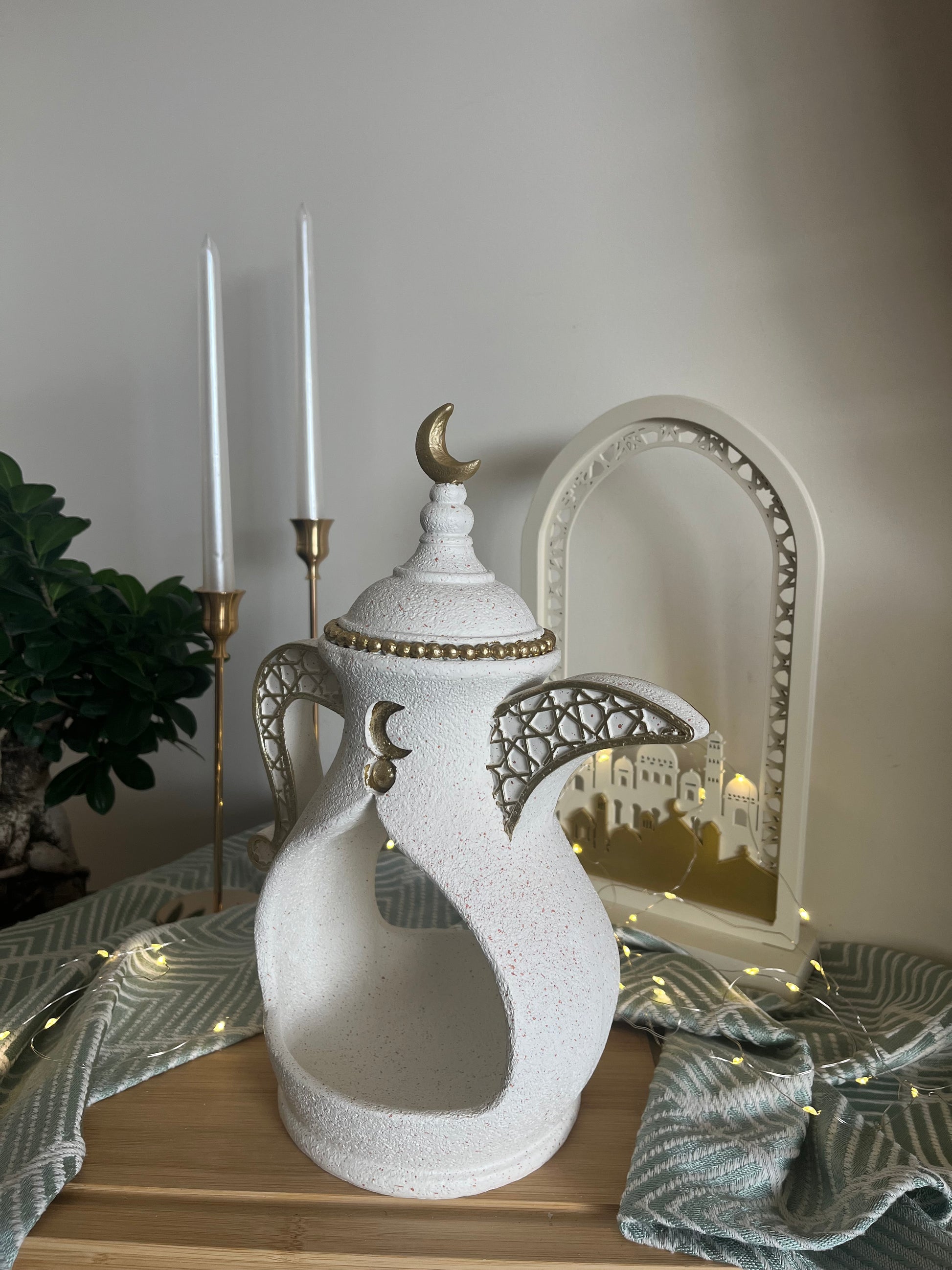 A charming Ramadan-inspired decorative piece shaped like a traditional Arabic teapot, finished in a soft textured white with elegant gold accents. Featuring delicate lattice-style handles, crescent moon details, and a refined gold trim, this piece blends heritage design with a modern touch. Perfect for holding dates or sweets, or styled as a tabletop centerpiece, it adds warmth and character to your Ramadan décor. 🌙✨