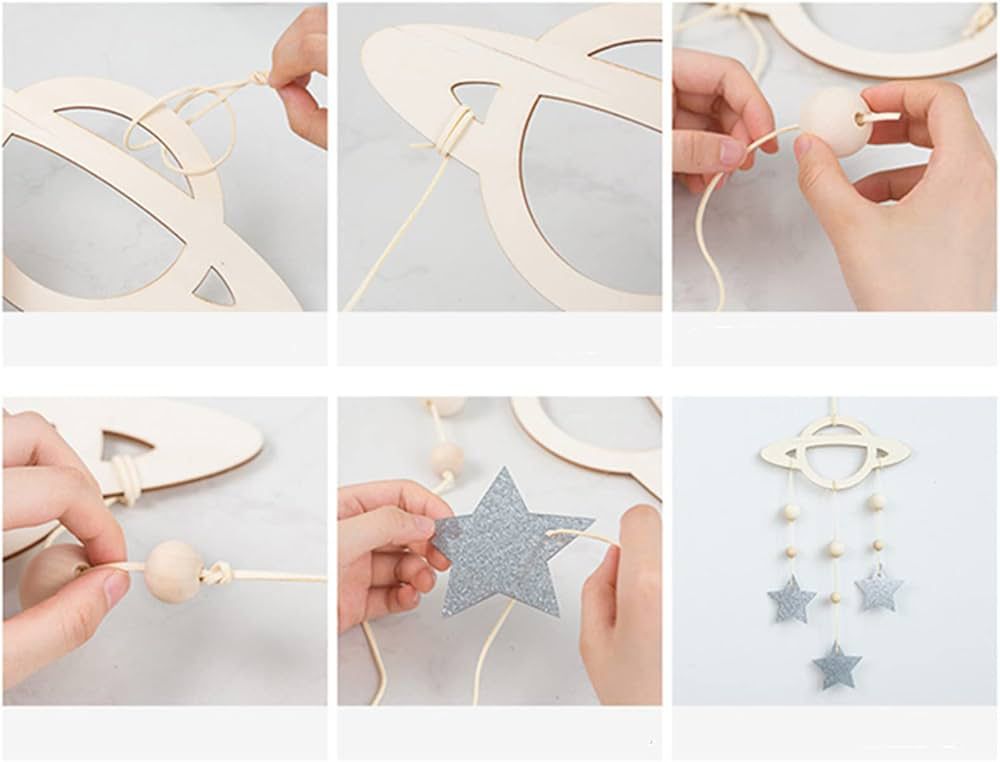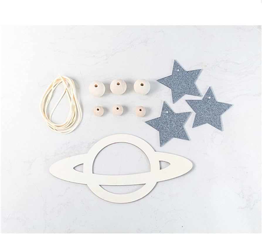 Light Wood Planet with wood beads & Shiny Silver Stars